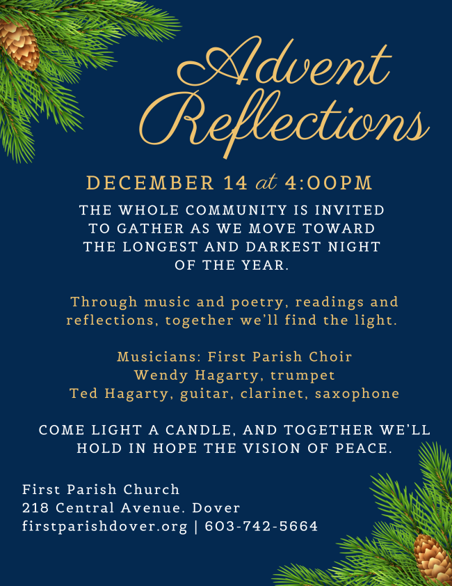 The whole community is invited to gather at First Parish Church as we move toward the longest and darkest night of the year. Through music and poetry, readings and reflections, together we’ll find the light. Musicians: First Parish Choir Wendy Hagarty, trumpet, Ted Hagarty, guitar, clarinet, saxophone. Come light a candle, and together we’ll hold in hope the vision of peace. Learn more.
