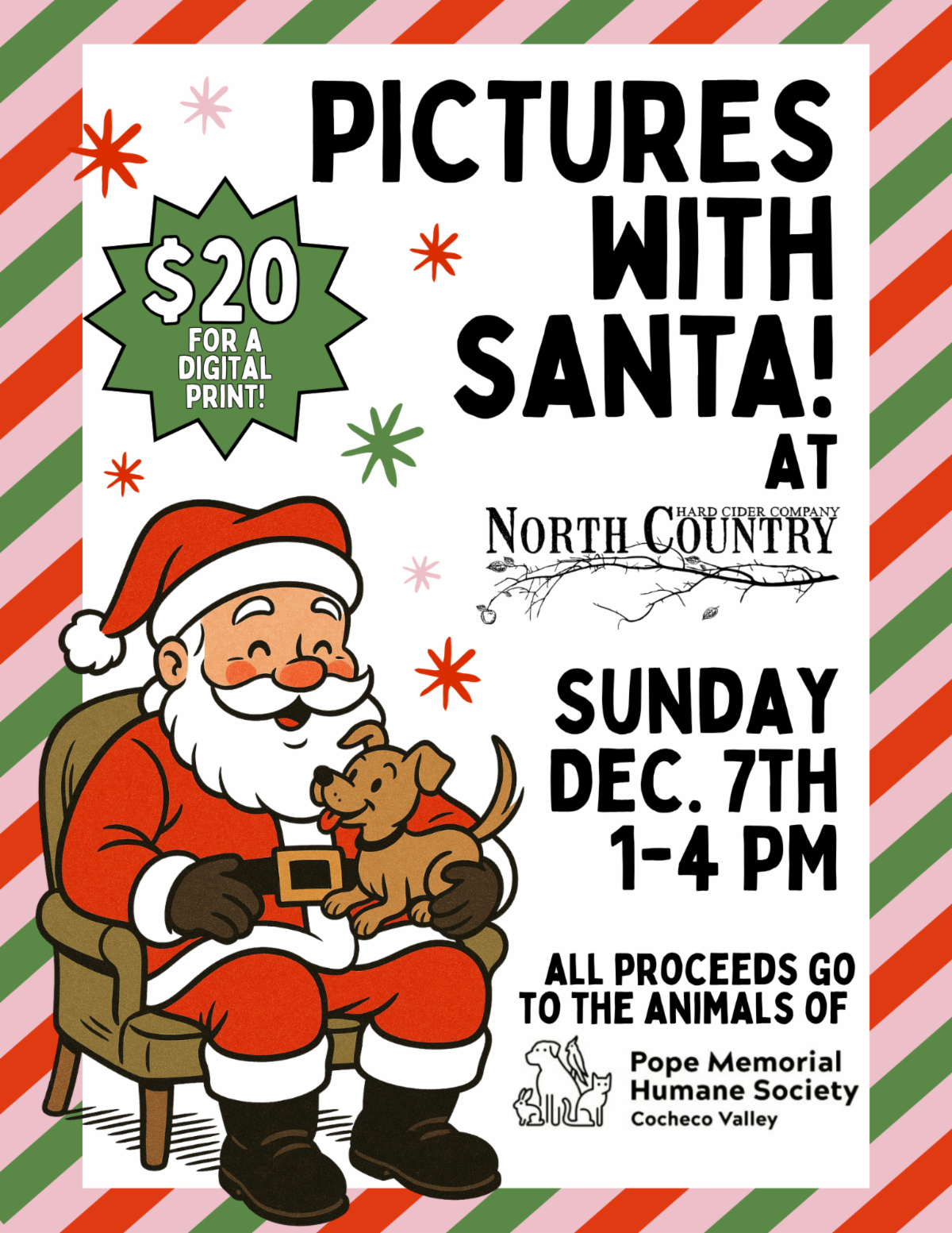 Pet Photos with Santa is back for another year of jolly good times, wagging tails, and festive fun. Bring your furry (or not-so-furry) friends to North Country Hard Cider to strike a pose with the one and only Santa Claus. Every dollar goes straight to helping the animals at Pope Memorial Humane Society.