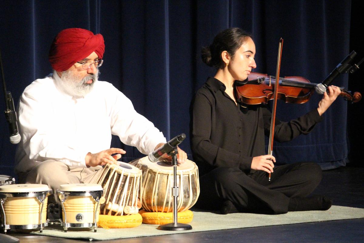 Inderjeet Sidhu (BHS '86) performs with his daughter, a current BHS student, at the annual Alumni Legends event. Sidhu is a percussionist who specializes in both Western style drum kits and Indian tablas.