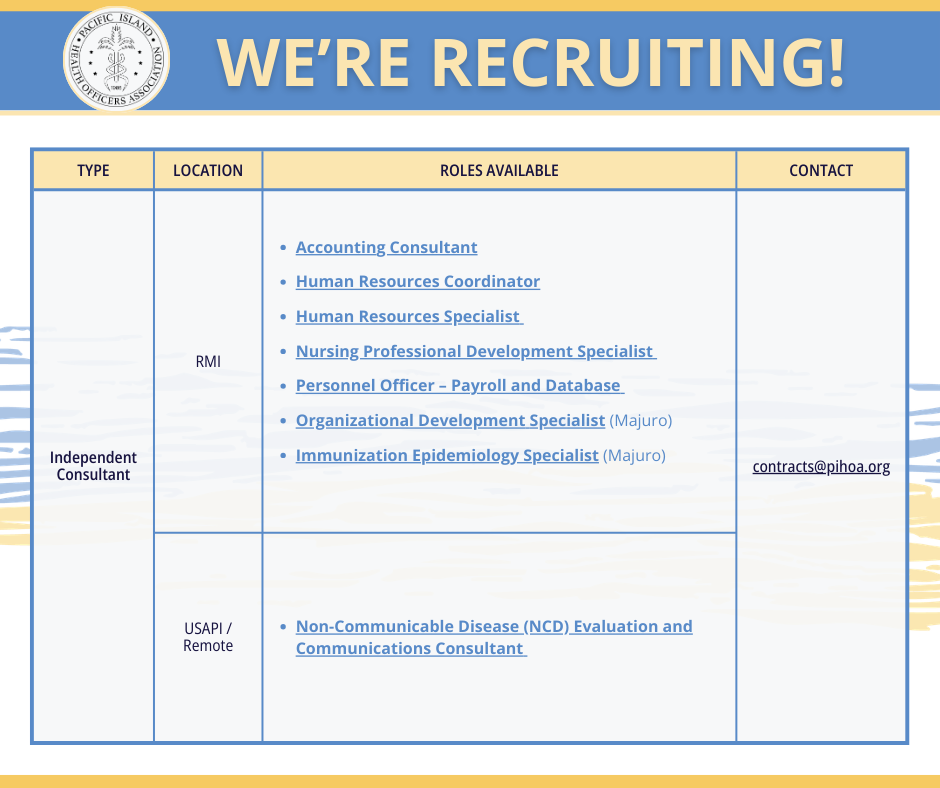 PIHOA's mission is to improve the health and well-being of the USAPIs by providing, through consensus, a unified, credible voice on health issues of regional significance. Established in 1986, PIHOA is governed by and represents the collective interests of the USAPI health leadership from American Samoa, the Federated States of Micronesia, Guam, the Republic of the Marshall Islands, and the Republic of Palau.