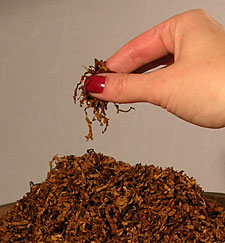 Most pipe smokers use the pinch test to determine the moisture content of the tobacco. Pinch a small clump of tobacco between the thumb and forefinger. The tobacco should for not more than a few seconds and then release itself. If the tobacco crackles, it is too dry. If it stays clumped it is too moist.