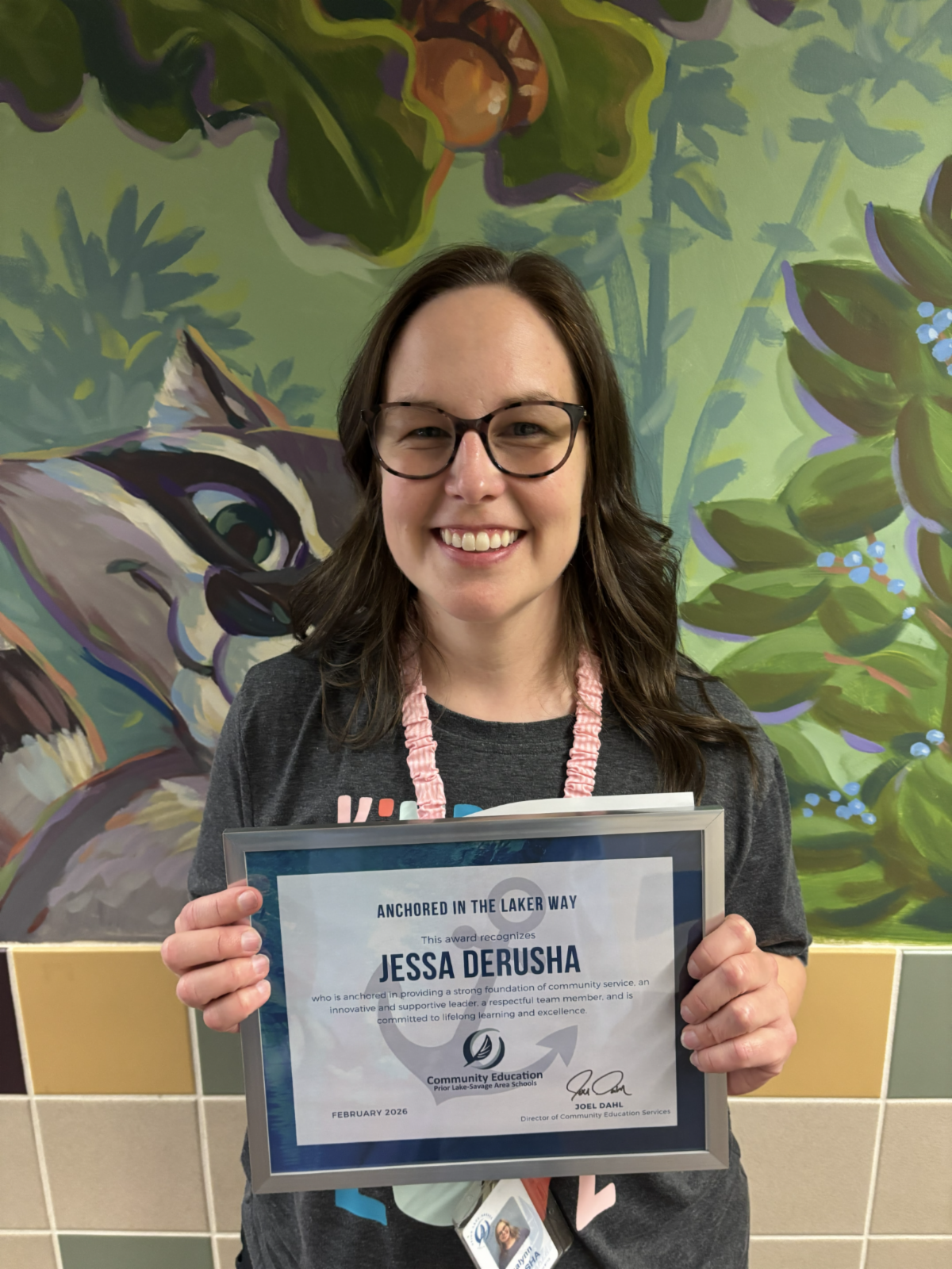 Early Learning Teacher Jessa DeRusha has been named the February 2026 recipient of the Anchored in the Laker Way Award. This monthly award celebrates Prior Lake-Savage Area Schools Community Education Services staff who are anchored in providing a strong foundation of community service, an innovative and supportive leader, a respectful team member, and committed to lifelong learning and excellence.
