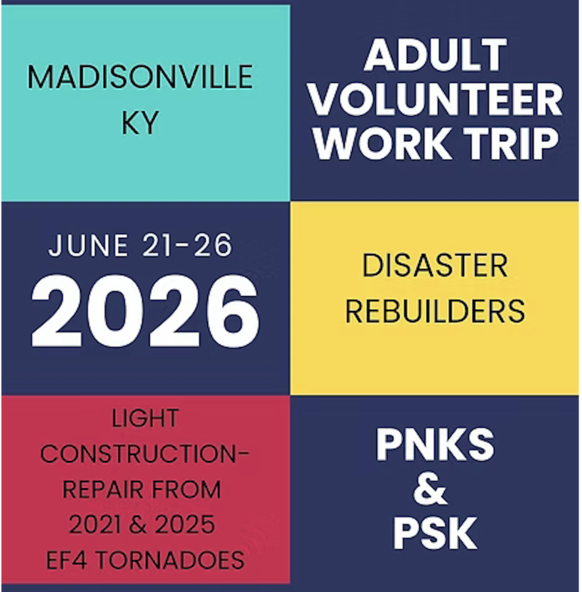 This year we will travel to Madisonville, KY to help with home rebuilding and repair after F1 tornadoes struck the area in both 2021 and 2025. The trip cost is $600, with a $200 scholarship from PNKS. We ask that local churches consider also contributing 1/3 of the cost.