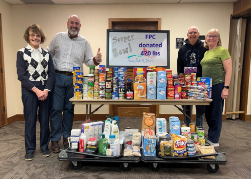 FPC Manhattan was on the winning team for Souper Bowl Sunday, February 8, 2026! When their generous donations of food and toiletry items were “tallied up” the totals were 420 lbs.! That’s more than the total number of offensive yards of either Super Bowl LX team this year! 390 lbs. of groceries will stock the FPC pantry with many essential items: flour, sugar, pancake syrup/mix, canned vegetables, and much more. About 30 lbs. of toiletries were taken to the Flint Hills Breadbasket, who initiated the event.