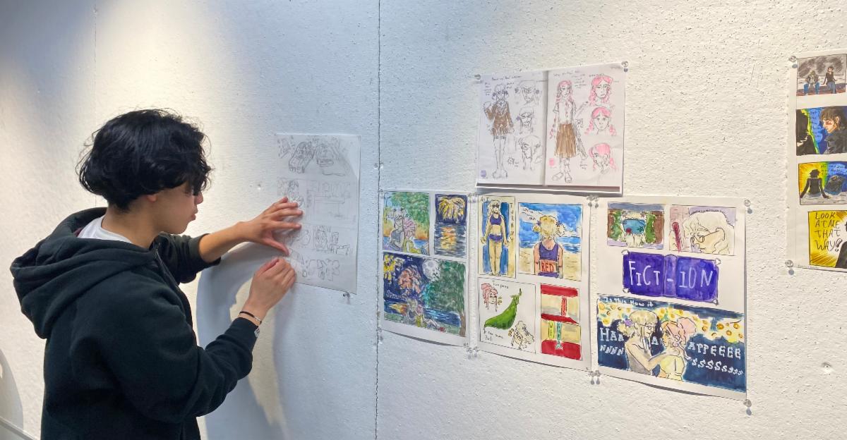 Intro to Animation with Christy Karacas How to Draw Comics with Cat Huang Jewelry + Metals with Hannah Oatman Public + Mural Art with Kendel Joseph |    | Above: Teaching Artist Hannah Oatman provides a demo for  teens. |    | Above: Alex R. hangs his in-process comic for class critique. |  |  |  |    |   |   |   | Above: Sahara S. sticks handmade paper to the POD Studio window. |    | POD + SCHOOLS
