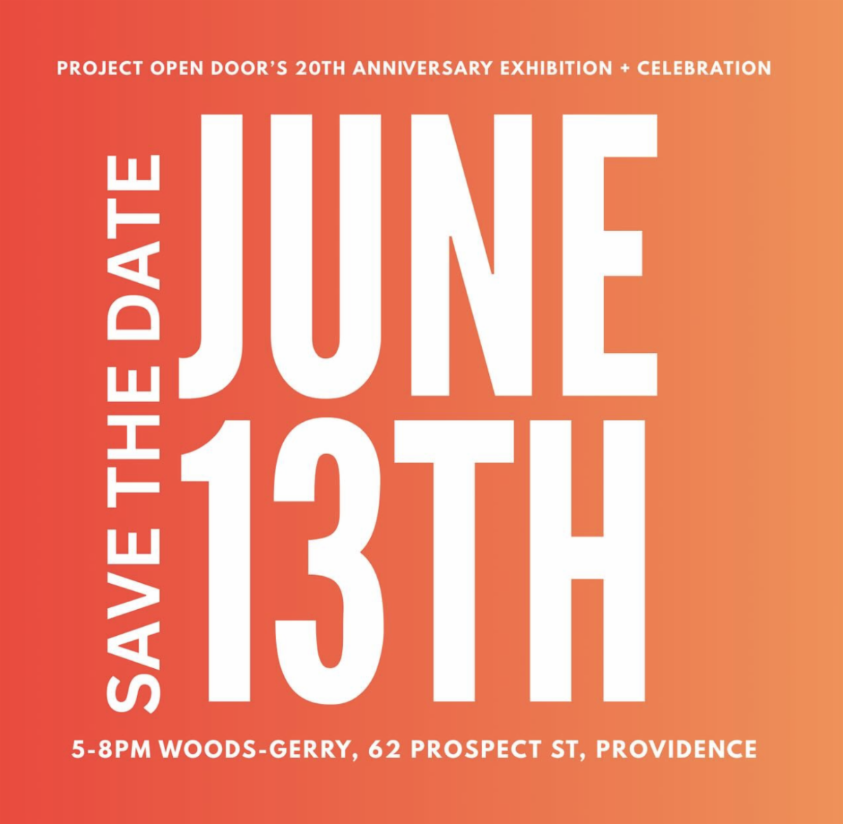 Friday, June 13th, 5pm - 8pm 20th Anniversary Celebration The entire POD community is invited to Woods-Gerry Gallery for a celebratory exhibition featuring work from POD teens, alums, teaching artists and TAs in honor of the program's 20th anniversary. Save the Date Below...Invitation and more information to follow!  |  |    |   | Project Open Door (POD) is immensely grateful to the generous support of the Hasbro Foundation, Ocean State Charities Trust, The Geneviève McMillan-Reba Stewart Foundation and the Rhode Island School of Design, whose investments in POD have made our work possible and sustainable, and directly impact the participating teens.
