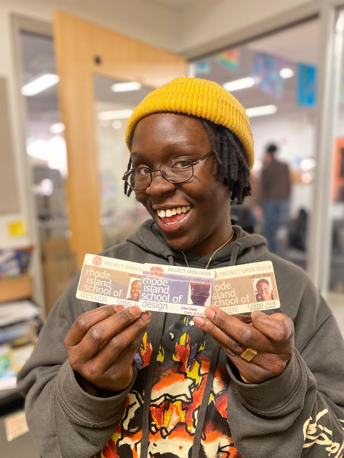 Over R.I.D.E February Break, POD hosted a photography program led by teaching artist Scott Lapham for partner Onward We Learn (OWL). Teens learned all about camera obscura, shutter speed and aperture, created pinhole cameras and more. We look forward to welcoming more OWL teens in a few weeks for April school vacation when we'll be hosting an apparel design class led by POD Teaching Artist Dorian Epps. |    | Above: The POD + OWL February break cohort. Photo Credit: Scott Lapham Below: An OWL teen poses for a collaborative light drawing  |    |  |  |    |   | Above: POD Alumni Julie is pictured with all of her ID cards from her three years at POD! |    | In January, we welcomed a fantastic group of POD alums back to the studio to catch up, spend time together, and share delicious food. This dinner also kicked off our pilot POD Alumni Ambassador Program, which will encourage alums to remain engaged with POD and offer professional and creative development opportunities. Alumni Ambassadors will also lend their valuable voices to the program by providing programmatic feedback, support, and mentorship to current teens.