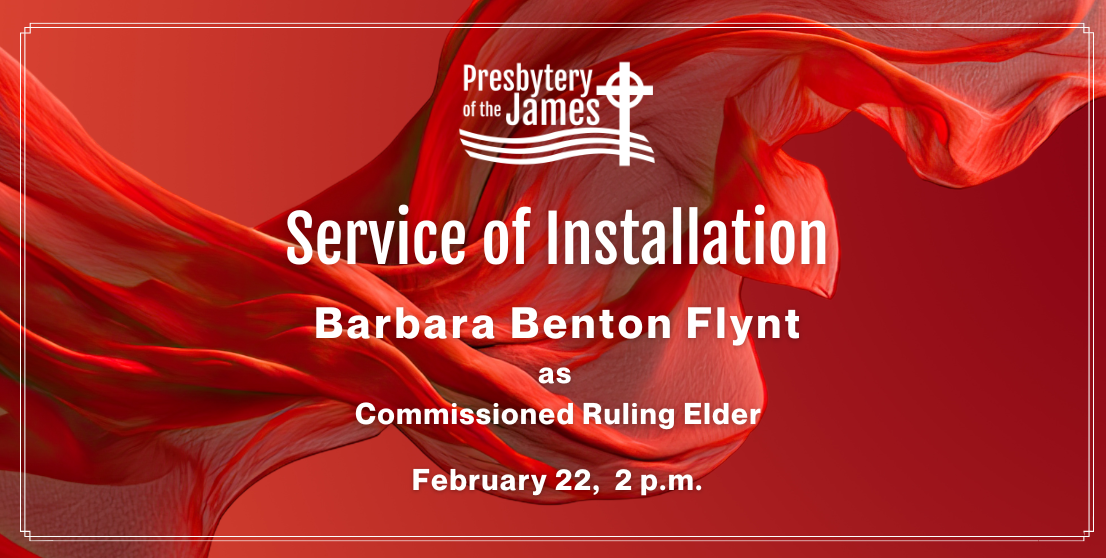 The Presbytery of the James invites you to the installation service of Barbara Benton Flynt as Commissioned Ruling Elder on Sunday, February 22, 2026, at 2 p.m. The service will take place at The Brandermill Church in Midlothian, Virginia (4500 Millridge Parkway, Midlothian, VA), or tune in to bit.ly/tbcnow at the time of the service to view online.