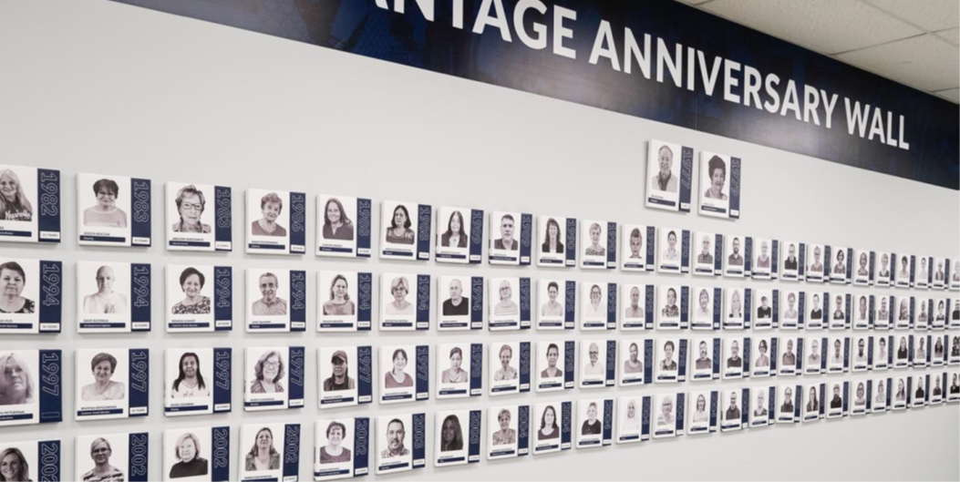 The Anniversary Wall reflects a core belief at Vantage: that people are at the heart of a successful company. Studies show that organizations with higher employee retention rates consistently outperform their peers. Long-term employees bring institutional knowledge, foster stronger workplace relationships, and drive sustained innovation.