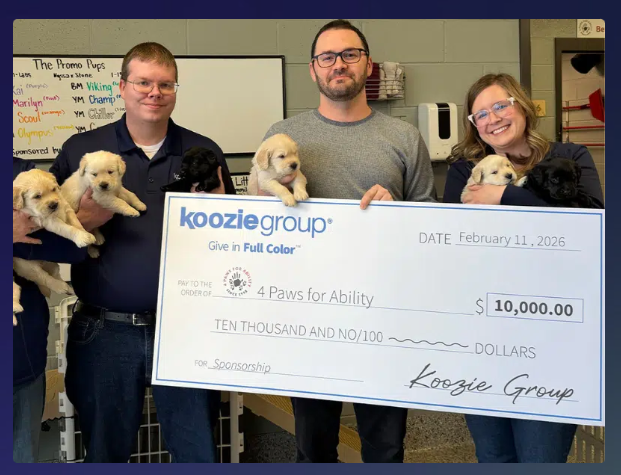 Clearwater, FL - Koozie Group has welcomed a second sponsored litter of puppies with 4 Paws for Ability and demonstrated continued support through a $10,000 donation. This brings Koozie Group’s total contributions to more than $64,000 since 2022.