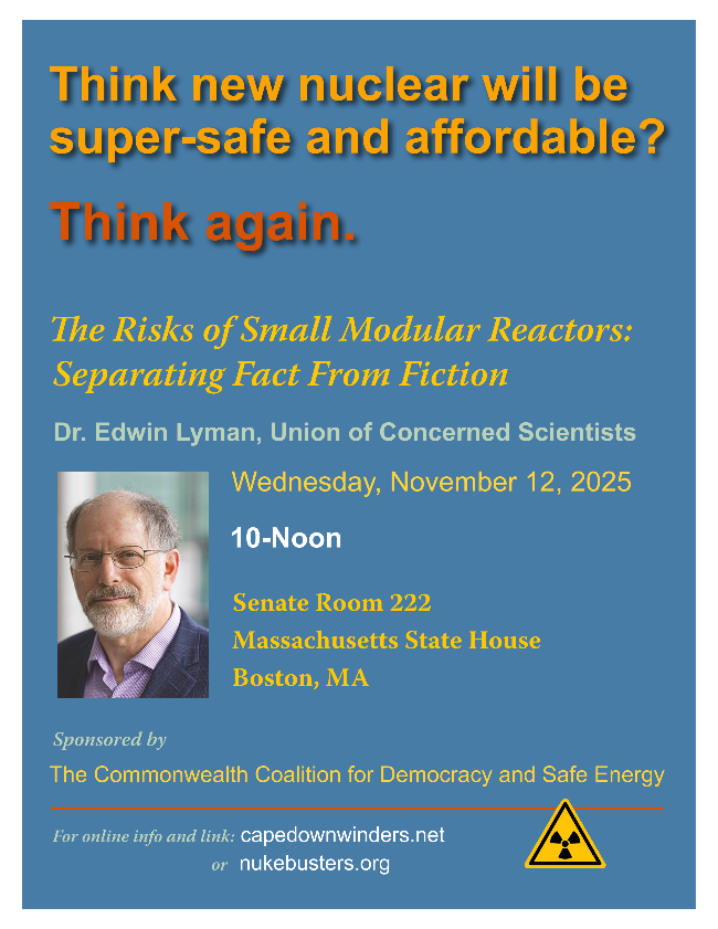 Dr. Lyman shares our concerns. He states, “The independence of federal nuclear regulators has been compromised and they can no longer be trusted to protect the public from nuclear plant accidents. The people of Massachusetts should not throw away a critical tool they have to defend themselves: the right to decide whether potentially unsafe, experimental nuclear reactors should be located in their state. These costly reactors would also exacerbate the energy affordability crisis in the Commonwealth.”