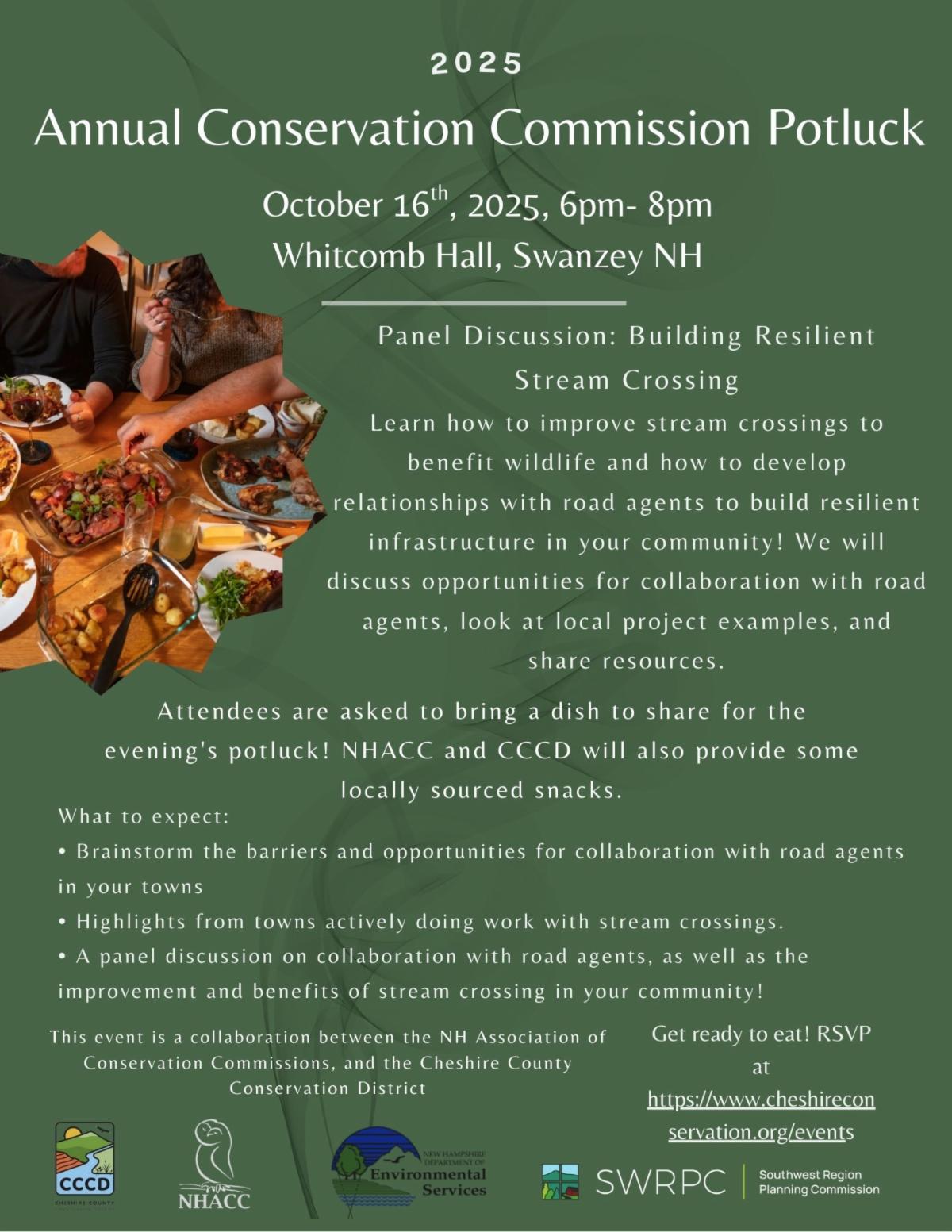 Walpole, NH (September 25, 2025) – The NH Association of Conservation Commissions (NHACC) and the Cheshire County Conservation District (CCCD) will host the 9th Annual Conservation Commission Potluck on Thursday, October 16th from 6:00-8:00PM at Whitcomb Hall (620 Old Homestead Highway, Swanzey, NH).