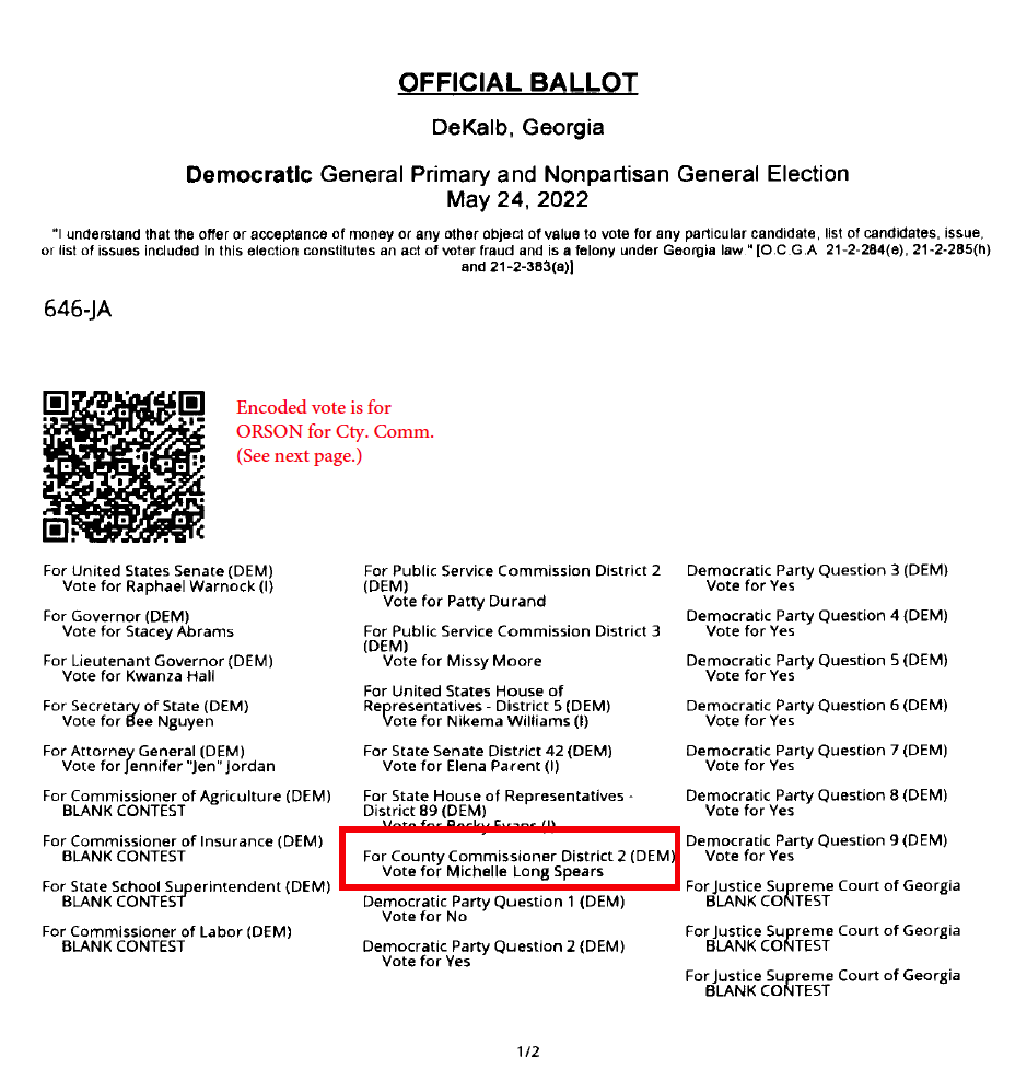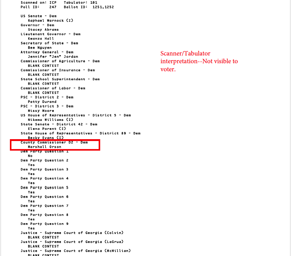 Voters cannot verify who they are voting for. The legally operative vote is encoded in an unreadable QR code, leaving voters unable to confirm or correct the vote that is recorded to be counted. (The text “interpretation” can be wrong. See example from the DeKalb May 2022 primary election.)