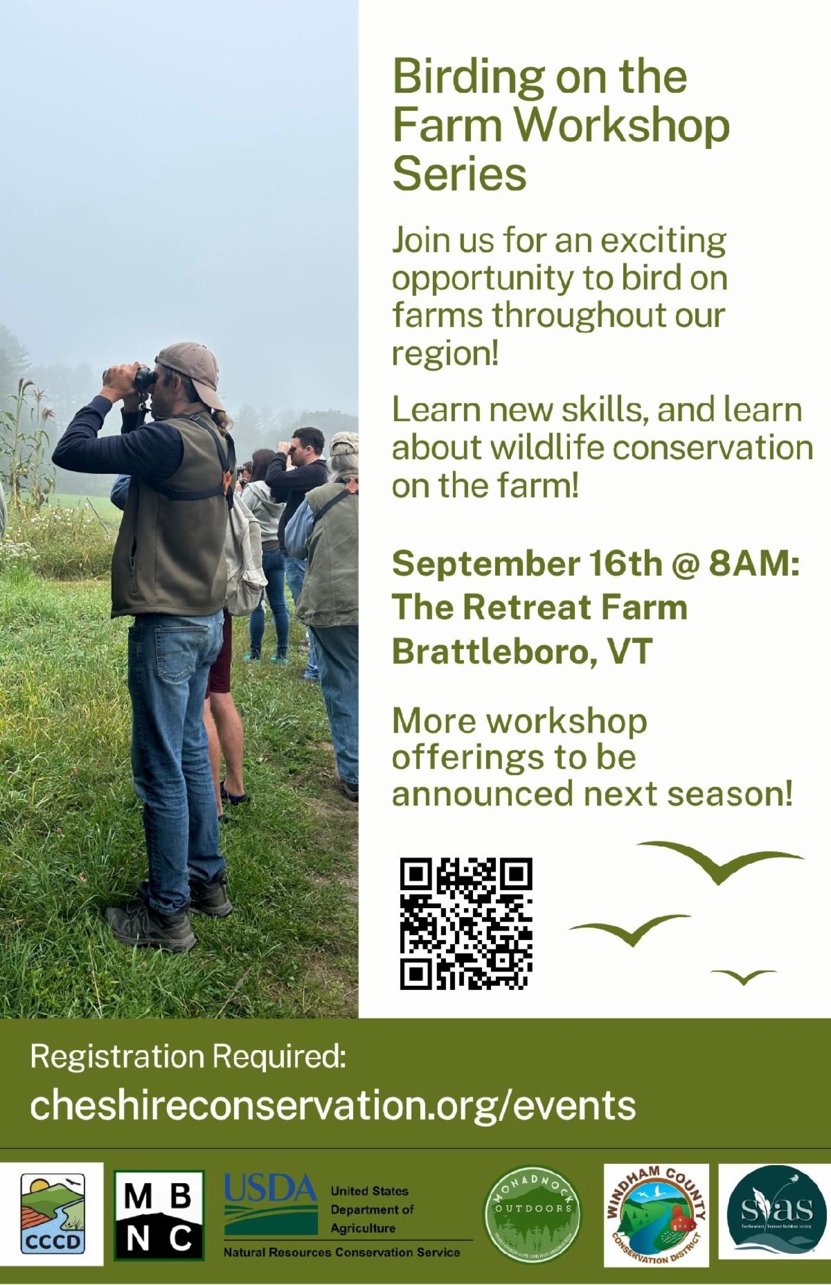 Walpole, NH (August 26th, 2025) – The Cheshire County Conservation District (CCCD) in partnership with the Monadnock Nature and Bird Club, USDA Natural Resources Conservation Service (NRCS), Windham County Natural Resources Conservation District (Windham NRCD), Monadnock Outdoors, and Southeastern Vermont Audubon Society are excited to continue the popular birding on the farm workshop series in September!