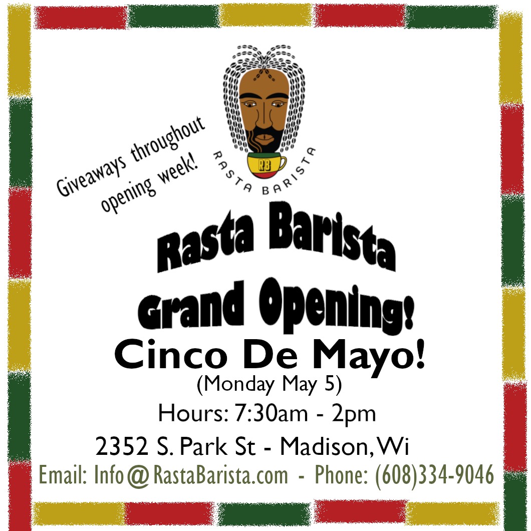 Madison, WI — May 1, 2025 — Rasta Barista Café will officially open the doors to its flagship location at 2352 S. Park Street, Suite 101, on Monday, May 5, with a grand opening celebration from 8:00 a.m. to 2:00 p.m. Guests will enjoy music, giveaways, complimentary samples, and a first look at an authentic Jamaican café experience unlike anything else in the region.