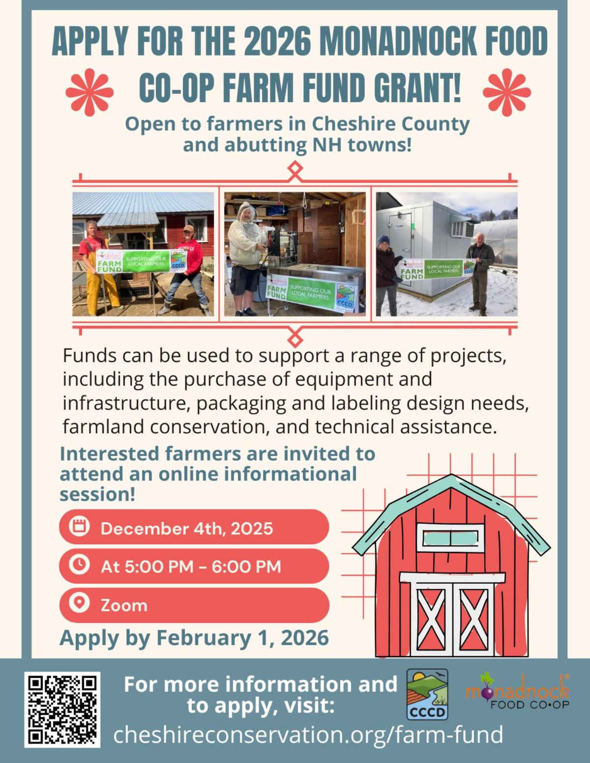 Walpole, NH (November 11, 2025) –The Monadnock Food Co-op Farm Fund program, in partnership with the Cheshire County Conservation District, is now accepting applications from local farmers. Currently, in its tenth year, the Farm Fund has awarded over $225,066 in grants to 28 local farms!