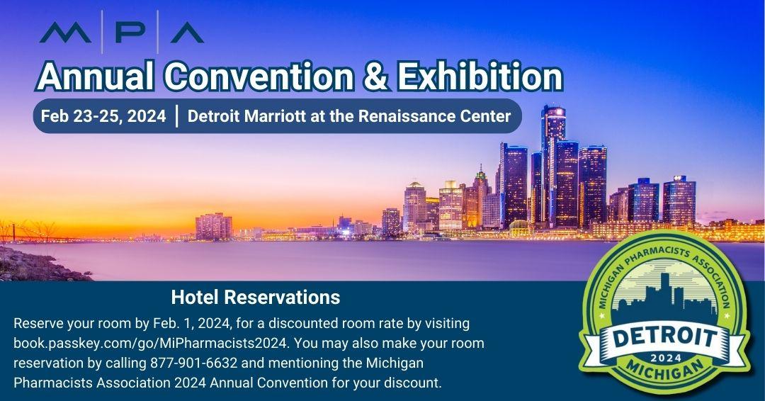 Reserve your room by Feb. 1, 2024, at this link for your discounted room rate. You may also make your room reservation by calling 877-901-6632 and mentioning the Michigan Pharmacists Association 2024 Annual Convention for your discount.