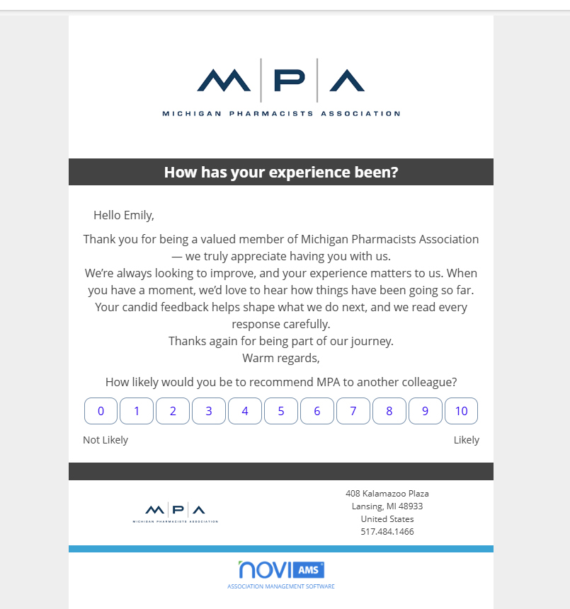 The below image is an example of what the survey will look like in your inbox. It only takes a minute and your input makes a big difference. Thanks in advance for sharing your thoughts!