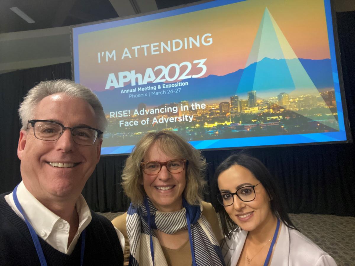 | | The University of Michigan's Karen Farris, middle, and MPA's Farah Jalloul, right, are pictured with MPA CEO Mark Glasper at the APhA Annual Meeting in Phoenix. | |