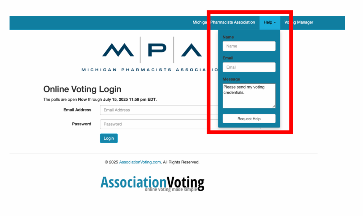 If your email does not come through with credentials, please visit https://vote.associationvoting.com/mpa and click on the help as indicated below and complete the form. An email from webmaster@associationvoting.com will provide you with the log in credentials. It will also notify staff for additional support if needed.