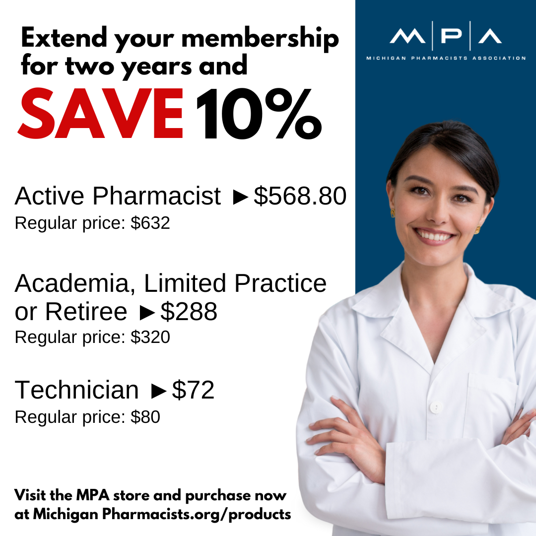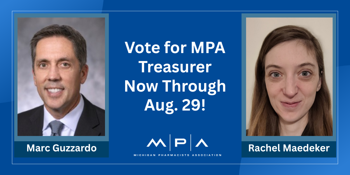 • MPA Treasurer Election: Deadline Aug. 29. MPA is holding a special election to fill the role of Treasurer on the MPA Executive Board. Eligible members received an email with their credentials to vote from announcement@associationvoting.com. If you did not receive the email or have questions, please contact Farah Jalloul-Rizk, FJalloul@michiganpharmacists.org.