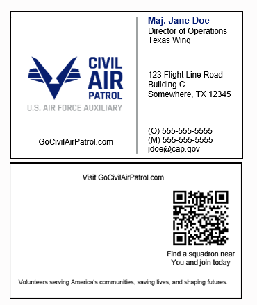 Go to this link to find the answer and to learn more about CAP's approved business card design (below) on the Brand Portal.
