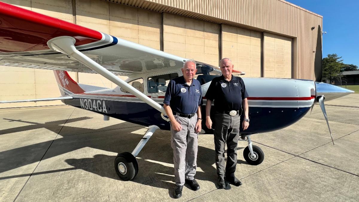 Congressional Squadron pilots Lt. Cols. Mike “Bishop” Sheen (left) and James “Attila” Hyde, used the eight-hour flight to familiarize themselves with the aircraft, which includes a special search and rescue package developed by Garmin in the G1000 avionics suite designed to support CAP missions. Sheen and Hyde have combined for more than 10,000 flight hours.