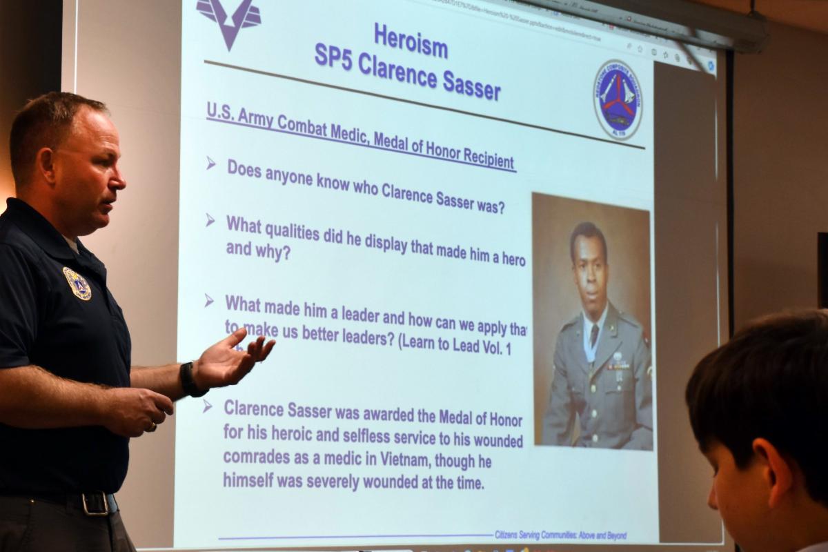 A Medal of Honor recipient’s heroism during the Vietnam War was the focus when cadets in the Alabama Wing’s Redstone Composite Squadron convened Oct. 21 for their monthly character development lesson.