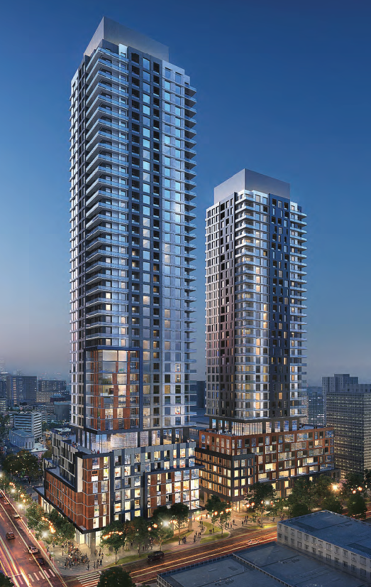 The proposed rezoning is from (DC1) Direct Development Control Provision and (RA9) High Rise Apartment Zone to a (DC2) Site Specific Development Control Provision to allow for two separate residential towers on commercial and residential base structures.