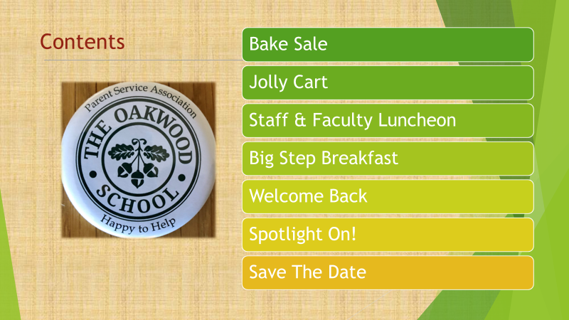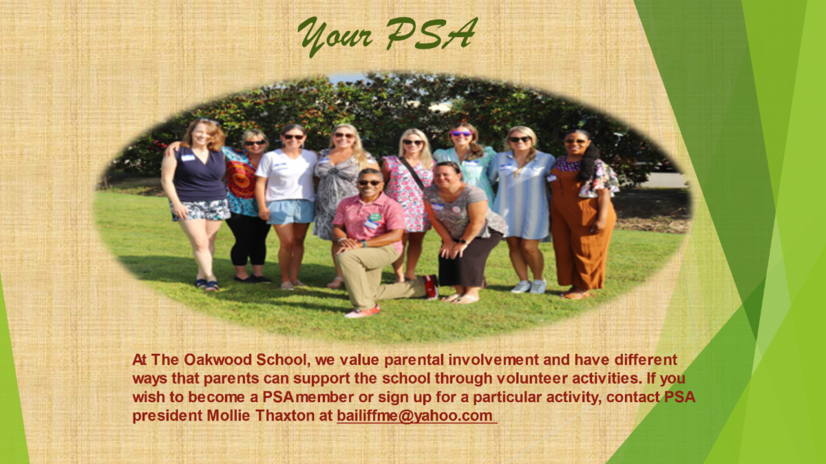The PSA strives to improve the quality of overall campus life by providing programs and activities that encourage participation by the whole School community. The mission of the PSA at Oakwood is to assist in the promotion of excellence for the school through active parental involvement.