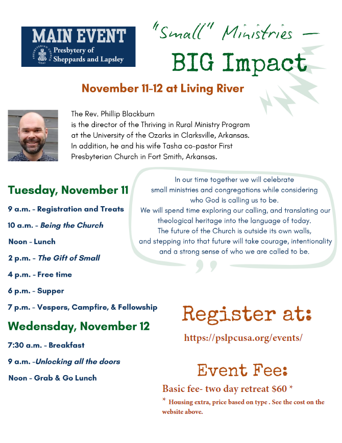 Living River's Fall River Fest, a Sunday event filled with activities and fellowship, is scheduled for October 19. Some congregations have relocated their worship services from their buildings to Living River for that Sunday. Other congregations encourage congregants to go as they are able. We hope this event can be a part of and enrich your congregation's life annually! There are a few graphics attached about the event. Please reach out if you have any questions or need more information. We could also use donations to cover the food for the event and volunteers!