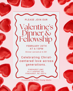 The Young Adult ministry would like to extend an invitation to all married couples at PUMC for a Valentine's Dinner & Fellowship on Friday, February 20 at 6:15pm. This event is designed to create intergenerational connections as we share stories of life and faith together. Any local college-aged students are encouraged to attend along with PUMC couples of all ages. Dinner will be served at 6:30. We hope you will join us for this special opportunity to celebrate Christ-centered love across generations.