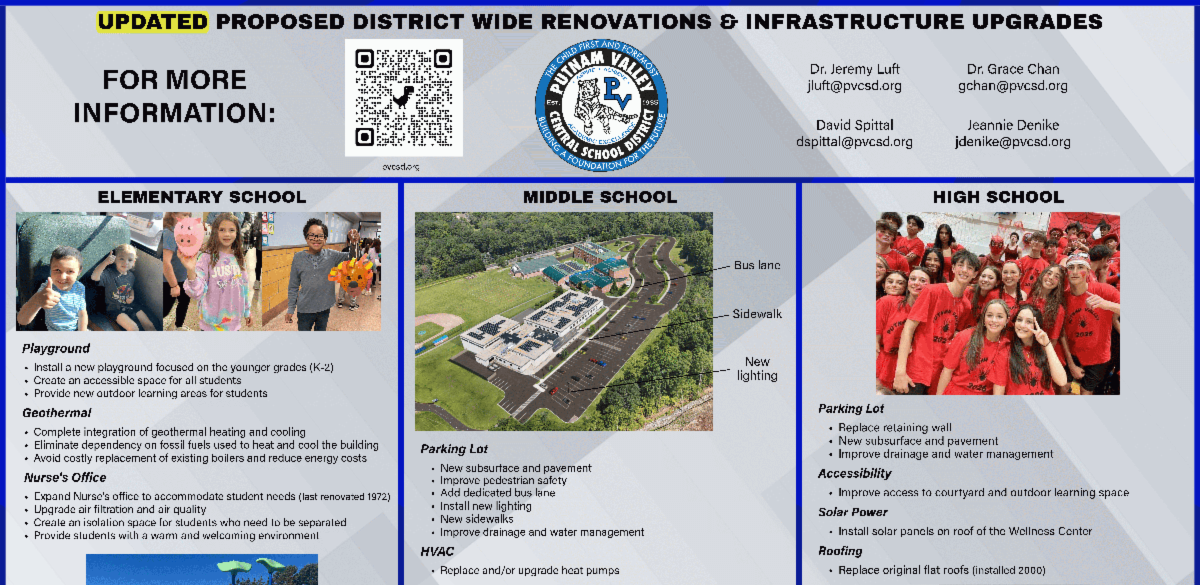 In other exciting news, the District has recently received final approval from the New York State Education Department to move forward with our District-wide capital project - approved by voters last spring. Following the competitive bidding process, contracts will be awarded to the lowest responsible bidders. This project includes parking lot and roof improvements at the Middle and High School, HVAC upgrades at the Middle School, and several enhancements at the Elementary School, including a new playground, upgrades to the nurse’s office, and geothermal heating and cooling.