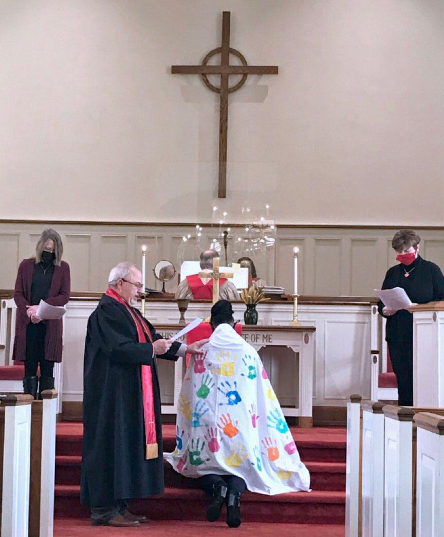Enslow Park Presbyterian Church in Huntington ordinated and installed new elders last month. The service was online, so Michelly Frizao, an artist at the church, made a wrap depicting the laying on of hands since it couldn't be done in person.