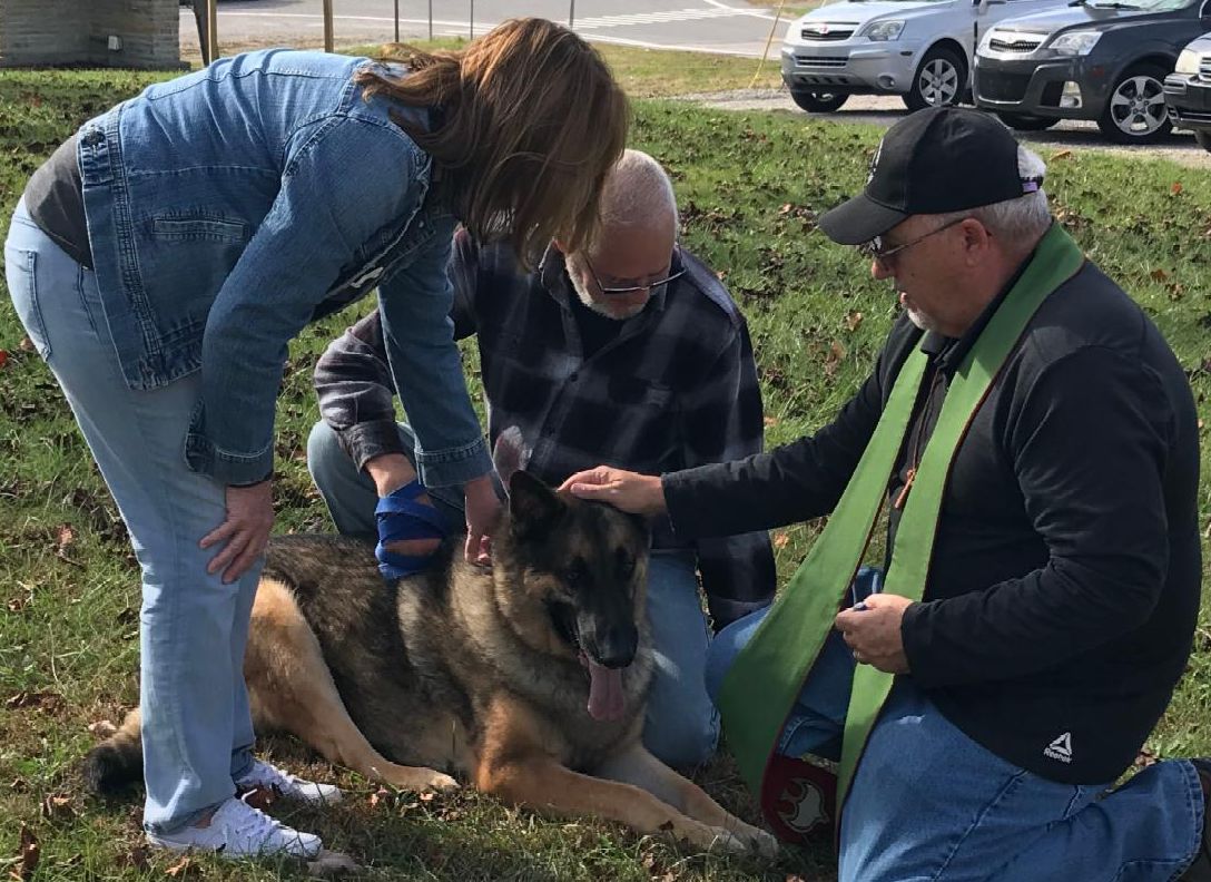 Eleanor Presbyterian's first Blessing of the Animals was held Nov. 10 with more than a dozen dogs present. Following an introduction by Pastor John Yeager (at right in both photos) and a reading by Clerk of Session Bev Luikart, each animal was blessed with myrrh oil and a prayer was said. Those animals who were not able to be there or who had crossed the Rainbow Bridge were also prayed for.