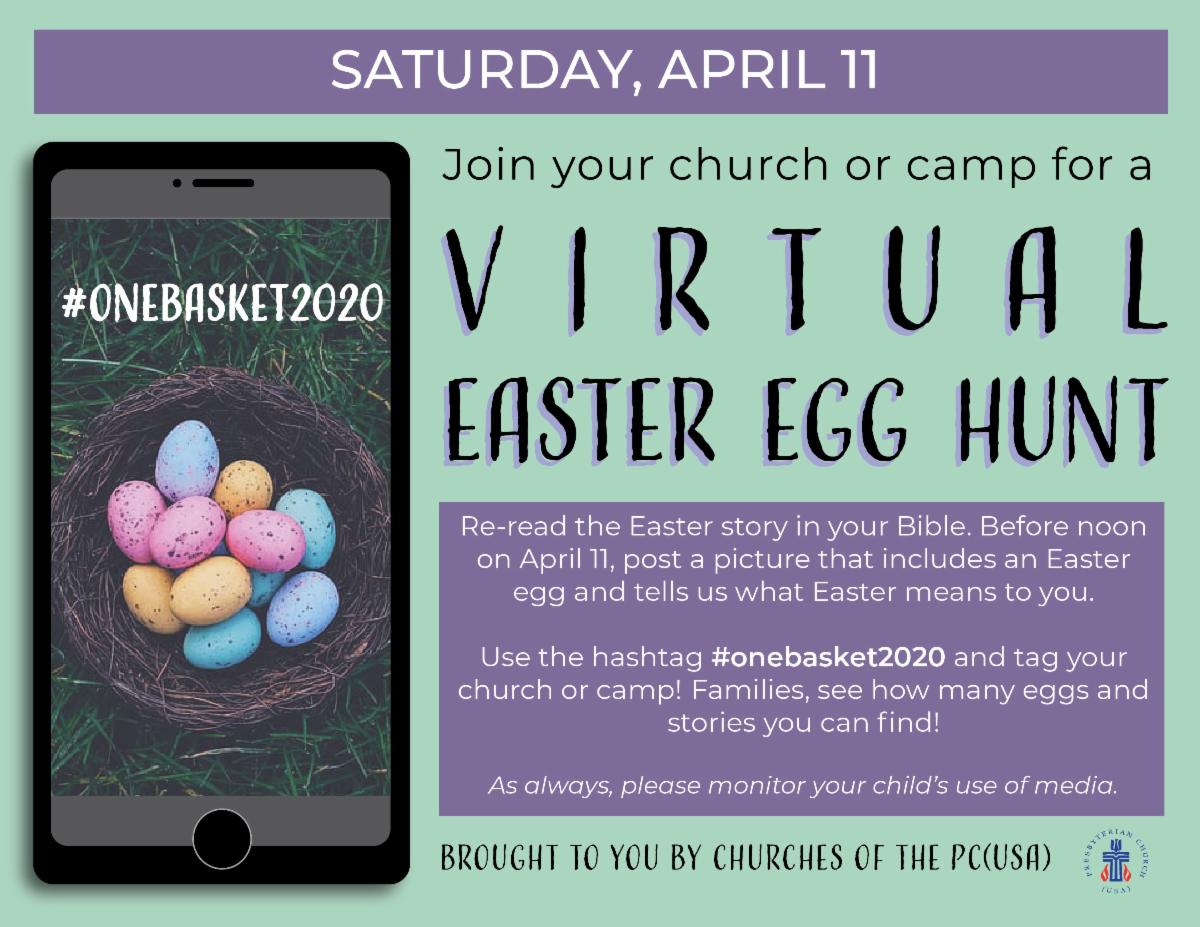 - Congregations are being asked to consider the Easter story in scripture, provide a picture of an egg and say what Easter means to them. These should be posted on Facebook and/or Instagram by noon Saturday. The posts will be connected using the hashtag #onebasket2020 and will include a tag of the church or camp ministry.