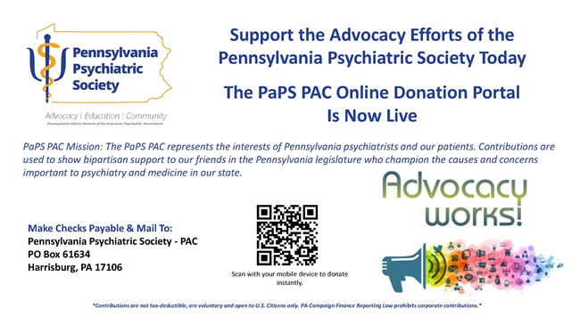 The PaPS Social Media and Communications Committee is reaching out to invite you to join our private Facebook group, Pennsylvania Psychiatric Society, a professional online community created exclusively for Pennsylvania psychiatrists. The group is designed to facilitate the exchange of clinical insights, discuss the latest developments in psychiatry, and support peer-to-peer collaboration in a respectful and enriching environment.