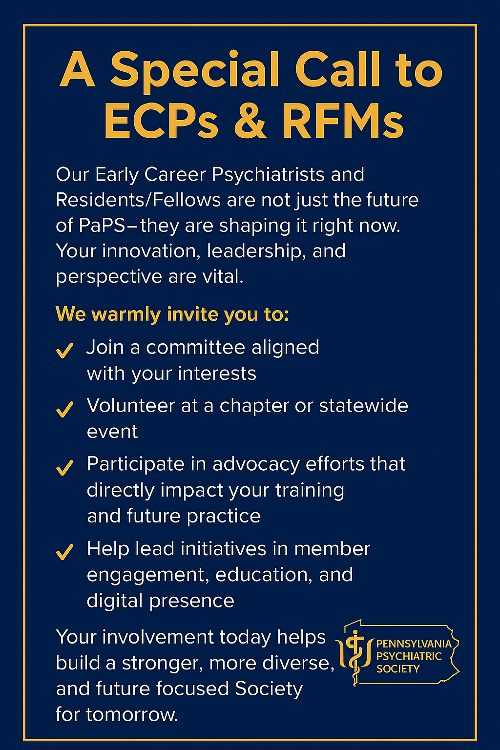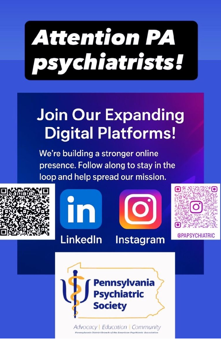 | | | April 11, 2026 Psychosis Case Conference New this year! Speaker and panelists PCOP Rockland | | | April 18, 2026 Women’s Brunch at The Inn at Swarthmore | | | November 10, 2026 Resident Research and Awards Night Sheraton Pittsburgh Hotel at Station Square | | | Kenneth Certa, MD, DLFAPA | | Government Relations Update | From abrupt SAMHSA cuts to new rural health funding, AI regulation debates, and gambling-addiction policy—this month’s update highlights the key forces shaping mental health care in PA. | | Dhanalakshmi Ramasamy, MD, DFAPA | | Why I Chose to Get Involved | “No psychiatrist should feel like they’re in a silo.” Dr. Dhanalakshmi Ramasamy shares how organized medicine built her network, strengthened her voice, and elevated patient care. | | Barbara Schindler, MD, DLFAPA | | My Cobbled Road to a Career in Addiction Psychiatry | Dr. Barbara Schindler’s unexpected path into addiction psychiatry reveals how one physician turned stigma, bias, and two major drug epidemics into opportunities for meaningful change. Click below for more on this must-read journey of impact and advocacy. | | | | A medical student’s journey from neuroscience labs to street medicine—discovering the heart of psychiatry and importance of self care along the way. | | Thanks Drs. Albaugh, Marchionni, Selarnick & Tripp for sharing your snowy day photos with the membership! Click here to view. | | Adam Tripp, MD, PhD, FAPA | | On Becoming a Pirate: A Guide to Private Practice | Ever wonder what it’s really like to leave the Navy ship of institutional psychiatry and captain your own pirate vessel? Here’s the honest, humorous truth about private practice—freedom, chaos, and toilet paper included. | | | | Spotlight on Lehigh Valley Chapter of Pennsylvania Psychiatric Society | The Lehigh Valley is exploding with new psychiatric training programs, innovative services, and game-changing collaborations. Get a front-row seat to the region’s rapid rise as a mental health powerhouse in our latest chapter spotlight! | | | | PaPS Involvement as a Resident | Lehigh Chapter | Meet the resident who’s transforming what it means to be engaged in organized psychiatry. Mosam Naik, DO, is bringing fresh momentum, creativity, and community-building energy to PaPS—and her story will make you excited about the future of our field. | | | | Navigating the Gray Zone: Clinician Perspectives on Industry-Sponsored Education | Industry-sponsored CME: valuable, biased, or both? See what your colleagues said. Authors: Mayenha Guerrier, MD (Post-doc research fellow) Dereje Negatu, Ph.D (bio-statistician) Kevin Holsey, MS- III (St. Luke’s- Temple) Howard Levin, MD (St. Luke’s University Health Network) | | | | Sobriety is a state; recovery is a lifestyle | Sobriety is a state—recovery is a lifestyle. Dr. Daniel Neff explores what many clinicians miss: the strengths, challenges, and cultural richness of patients living in long-term recovery. A powerful message for every psychiatrist. | | | | APA Statement on Mental Health During Times of Unrest | |