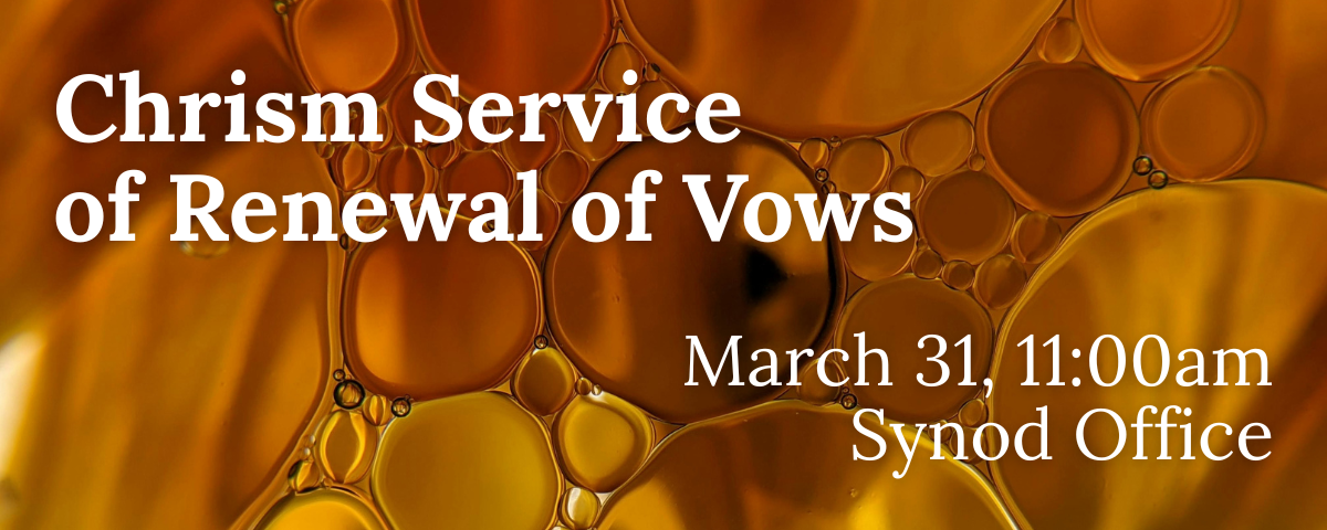 Pacifica Synod and Bishop Dave will be hosting a Chrism Service of the Renewal of Vows on Tuesday, March 31 at the synod offices, located at 1801 Parkcourt Place, Building C, in Santa Ana. The service will begin at 11:00 am and lunch will follow. There is no cost to attend, but we ask that you RSVP to Terri Robertson at terrirobertson@pacificasynod.org so we can provide an appropriate amount of food.