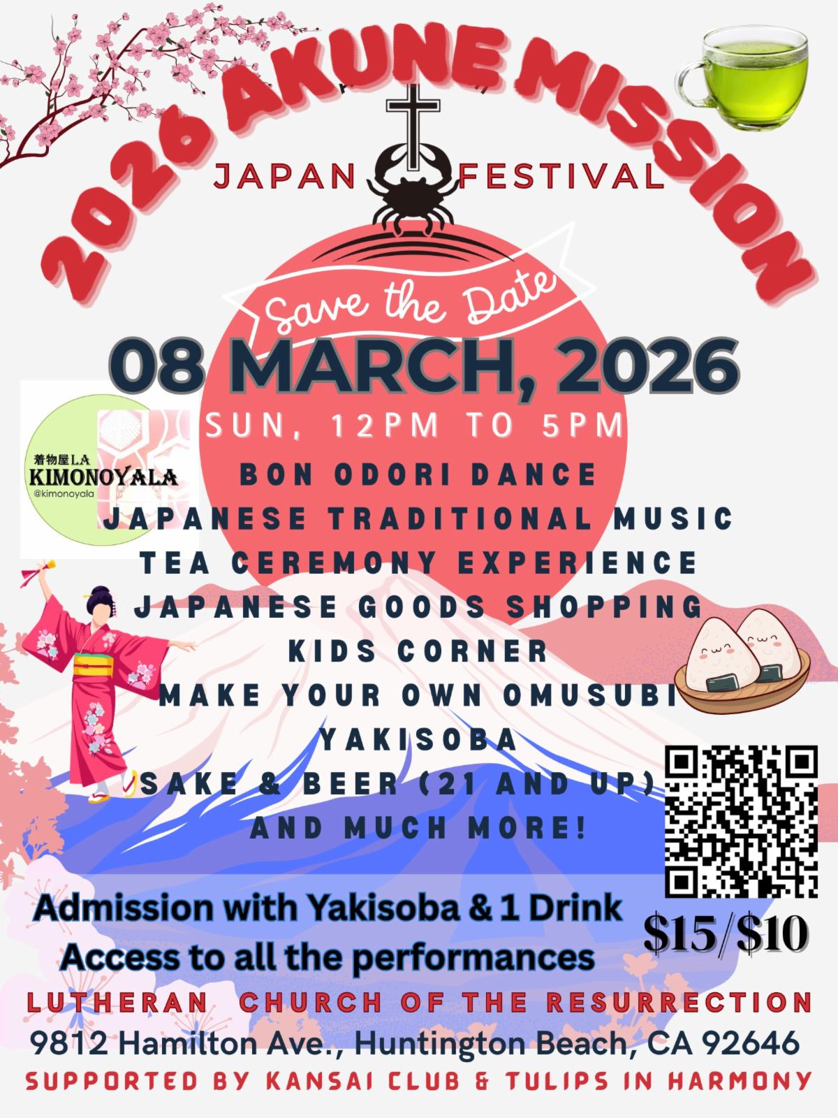 Lutheran Church of the Resurrection welcomes you to Huntington Beach on Sunday, March 8, from noon to 5pm for a Japan Festival. Experience many different facets of Japanese culture including Japanese dance, a tea ceremony, Japanese street food, and more. And it's all to raise money for the Hiroshima-based Akune Mission, a joint American/Japanese partnership of Christians and Buddhists committed to community renewal through culture, education, and service. Reserve your spot here.