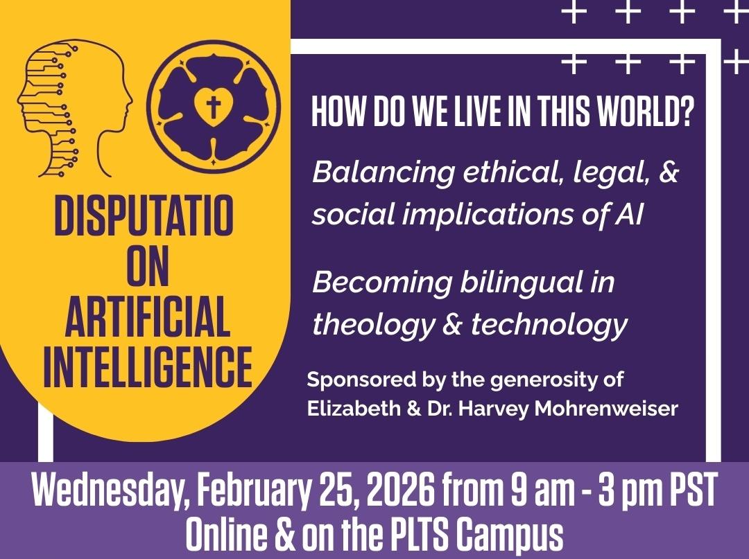 In a digital age that is always reforming, artificial intelligence (AI) has become part and parcel of living in modernity. Given its impact, as well as overwhelming enthusiasm for and protest against, it becomes necessary to ask: how do we best live in the world with the reality of AI? How do we respond to it faithfully and theologically? How do we equip leaders to accompany people in the decisions they will face? To explore this, Pacific Lutheran Theological Seminary will host a Disputatio on Artificial Intelligence following the medieval questio model in collaboration with powerful voices in medicine, ecology, and higher education. The events of the day include the main disputatio, worship, lunch, and a variety of themed generative conversations hosted by theology and AI experts. Join us online or in Berkeley on Wednesday, February 25 from 8:30am - 3pm for a dynamic day of inquiry! Get more information or register here.