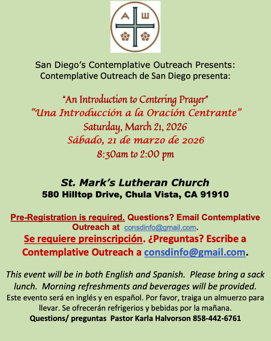 St. Mark's Lutheran in Chula Vista will be hosting an Introduction to Centering Prayer workshop on Saturday, March 21, from 8:30 am- 2 pm. This event will be bilingual in English and Spanish with the opportunity for more languages as needed. There is no cost but registration is required. You can register via email at consdinfo@gmail.com, or call Pastor Karla Halvorson with questions at 858-442-6761