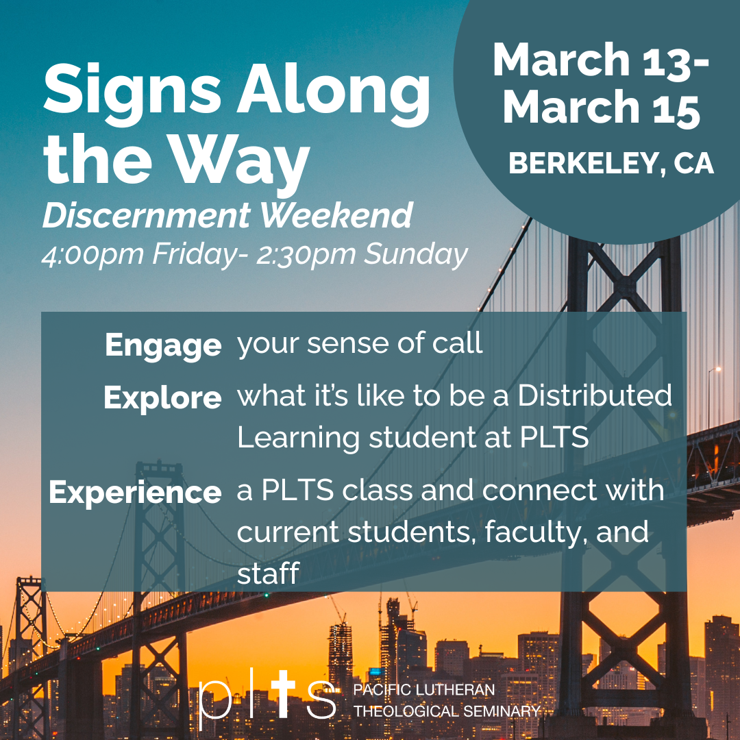 Are you wondering if seminary might be right for you? Consider joining PLTS's visit and discernment weekend, Signs Along the Way, March 13th through 15th in Berkeley, California. This weekend is a great opportunity to connect with others in discernment, get to know PLTS faculty, and explore what it’s like to be an online student in the MDiv, MA in Spirituality and Social Change, or Lutheran Year programs. As PLTS transitions to solely offering online study with in-person intensives, this weekend is designed for folks interested in online seminary education. PLTS covers lodging and meals during the event and can offer travel assistance for those who need it. Visit plts.edu/signs to learn more and sign up.