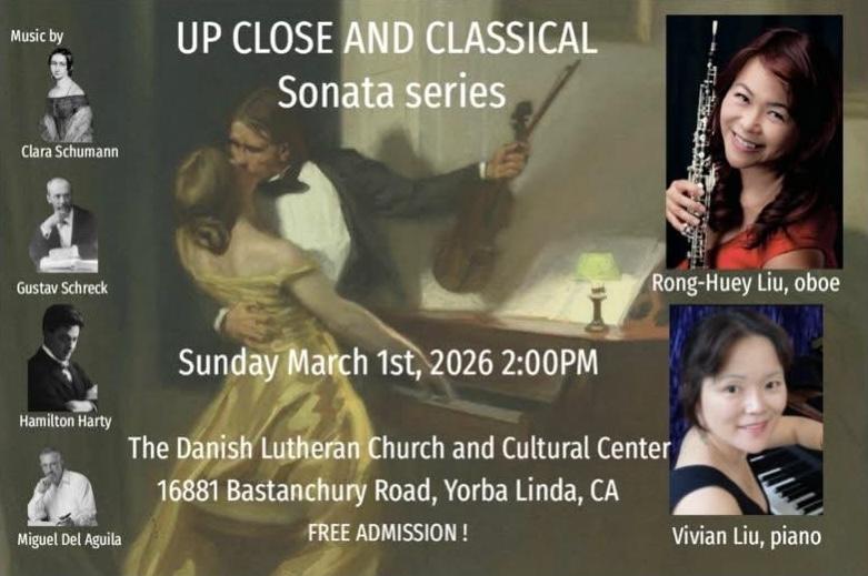 The Danish Lutheran Church and "Up Close and Classical" are collaborating on a series of free concerts in 2026, the first of which will be a Sonata Series featuring Rong-Huey Liu on oboe and Vivian Liu on piano, playing works by Schumann, Harty, Schreck, and del Aguila. Additional concerts will be held on Friday, April 3rd and Sunday, May 31st. For more information on this upcoming program, check out this flier.