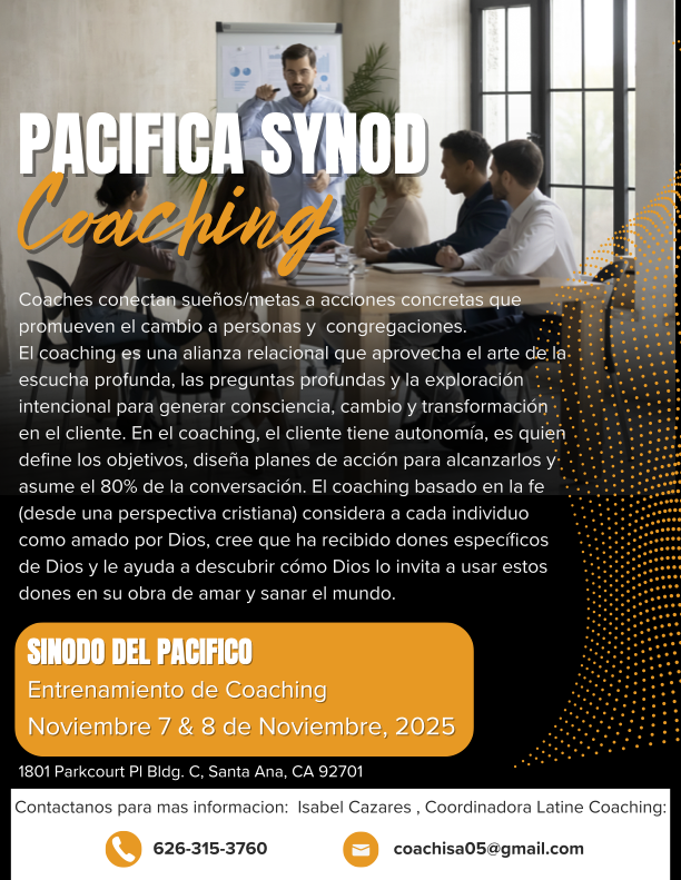 The Pacifica Synod is excited to be offering coaching training and resources to the Spanish-speaking members of your congregation. We will be hosting a two-day training workshop November 7-8 at the Synod offices. Registration information will be available soon, so save the date and keep your eyes peeled for more information!