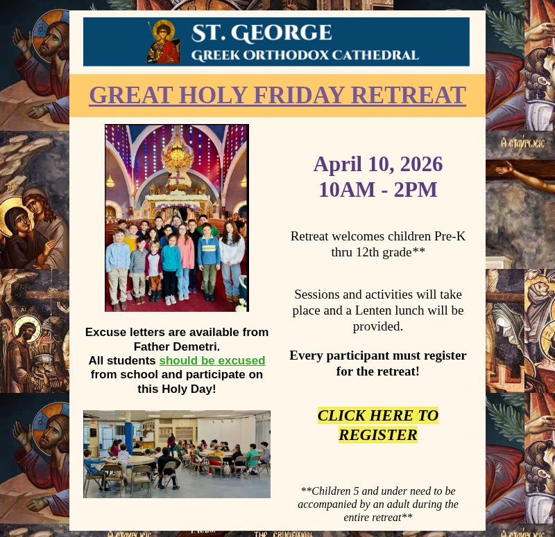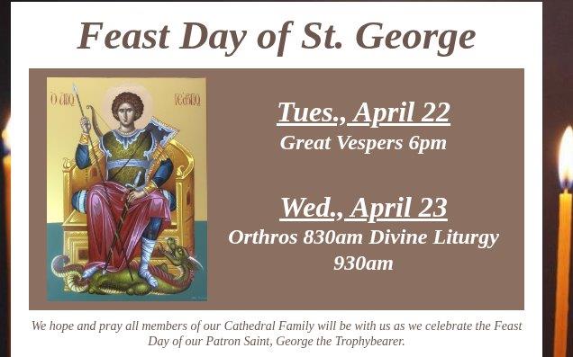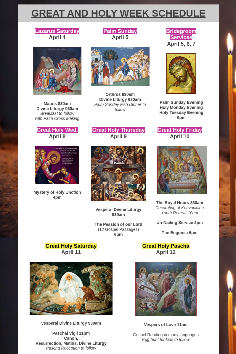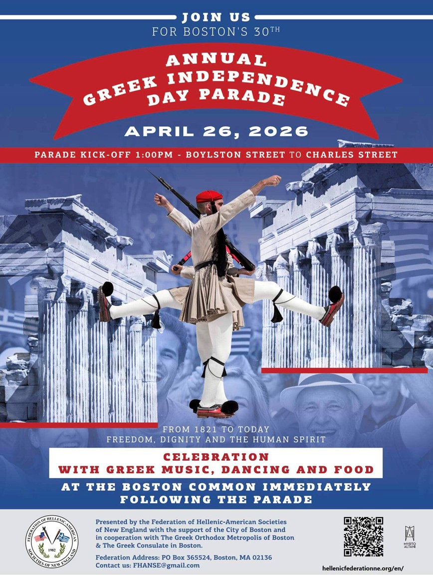 NOTE SERVICE TIME CHANGE ON APRIL 26 – Church services on April 26 will begin a half hour early to accommodate travel for those attending or participating in the Greek Independence Day Parade in Boston on that day.