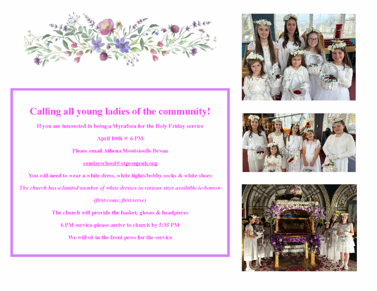 PART-TIME HELPERS/READERS NEEDED – We have services during Great and Holy Week. We welcome those who would like to assist and help with the readings. If you would like to volunteer to help with reading various Scripture passages or to chant, please come to the chanter stand before the service to offer your participation.
