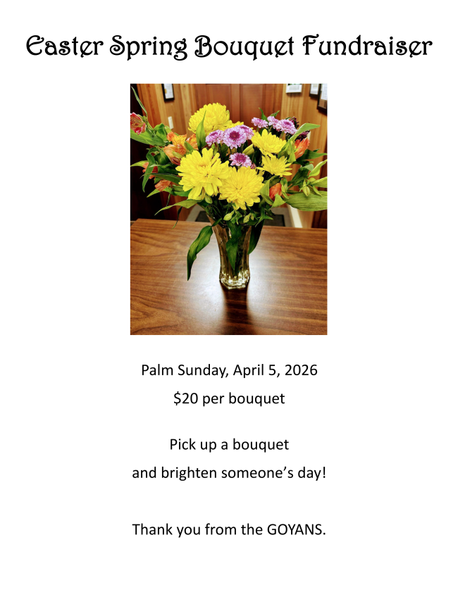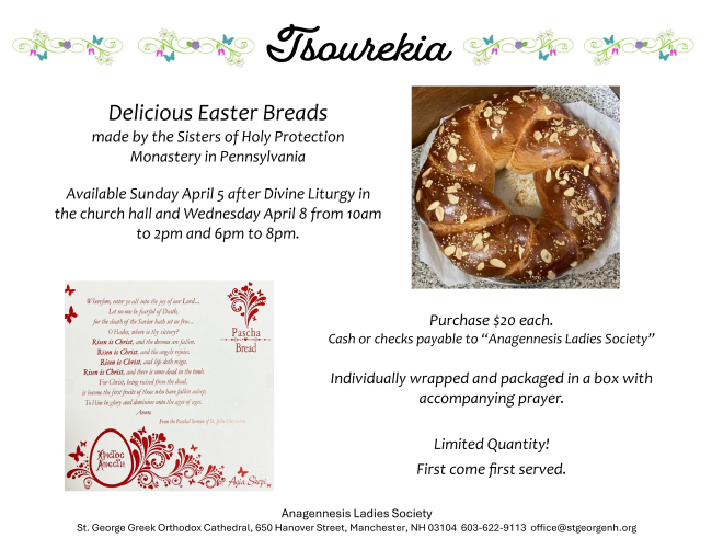 ANAGENNESIS EASTER FLOWER DONATION BOX – To make it easier for you to offer your donation for Lenten, Holy Week, and Pascha flowers and other needed items, a donation box has been placed in the Narthex/Nave of the church. Donations can also be dropped off at the church office or mailed. Your generosity is very much appreciated.