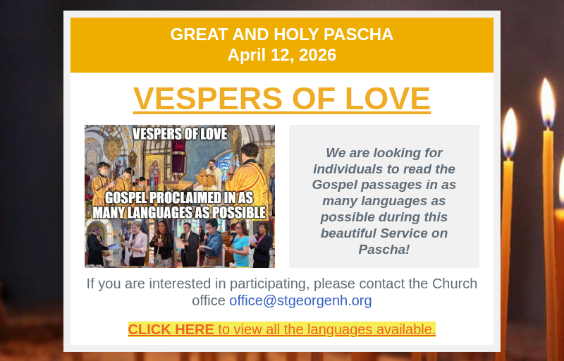 VESPERS OF LOVE SERVICE ON PASCHA - As we have in previous years, we are looking for those who can read foreign languages to proclaim the Gospel in as many languages as possible (which is the tradition of the Church at this service). Click here to see all the languages we have available