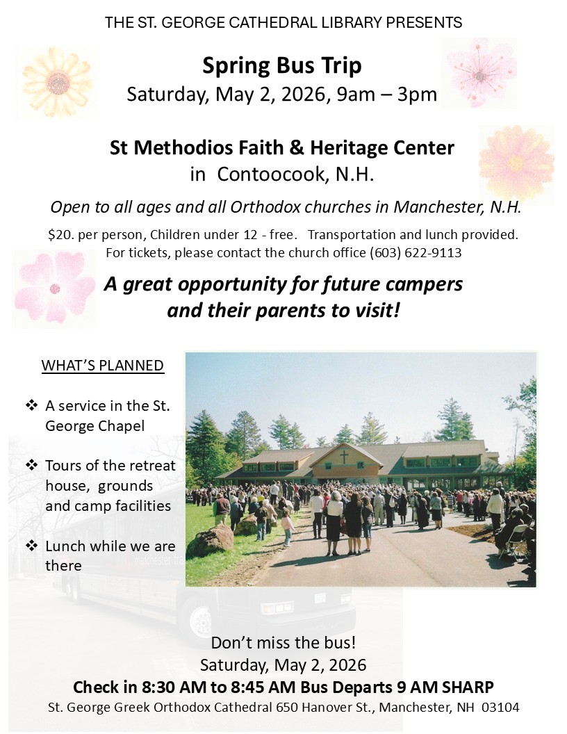 SPRING BUS TRIP – The Library presents a Bus Trip to St. Methodios Faith & Heritage Center on Saturday, May 2, 9am to 3pm. See the flyer in this bulletin.